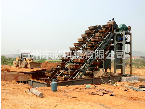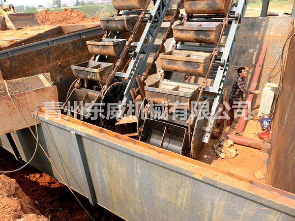 挖斗洗砂機(jī)工作時(shí),電機(jī)通過(guò)三角帶、減速機(jī)、齒輪減速后帶動(dòng)上料機(jī),均勻給料到滾篩進(jìn)行篩分,合格產(chǎn)品經(jīng)過(guò)溜槽進(jìn)入洗槽中,此時(shí)鏈斗裝置的動(dòng)力系統(tǒng)帶動(dòng)四角輪緩慢轉(zhuǎn)動(dòng),在鏈斗的帶動(dòng)下翻滾,并互相研磨,除去覆蓋砂石表面的雜質(zhì),同時(shí)破壞包覆砂粒的水汽層,以利于脫水;同時(shí)加水,形成強(qiáng)大水流,及時(shí)將雜質(zhì)及比重小的異物帶走,并從溢出口排出,完成清洗作用。干凈的砂石由挖斗提起,砂石從上四角輪倒入出料槽,完成砂石的清洗作用。