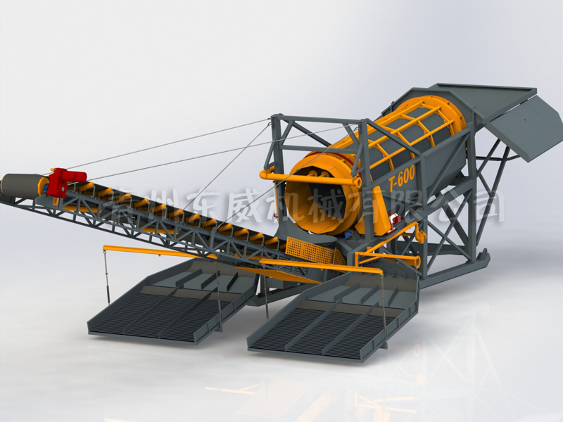 設備由料倉、滾筒篩、固定溜槽、鼓動溜槽、尾料輸送機、水泵組等系統(tǒng)組成,通過電機或柴油機驅動滾筒篩及其他水泵系統(tǒng),供水量可根據(jù)原料情況通過閥門調節(jié)水量大小。
