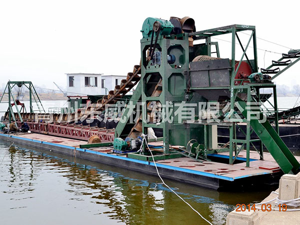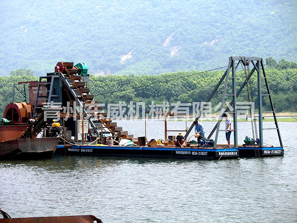 鏈斗式挖沙船可根據客戶性能要求及工礦作業特點設計制造。物料挖掘出來并由輸送機或輸送泵輸送至岸邊、運沙船的功能;浮體采用橫骨架式分體箱形結構,轉運時可拆裝后裝車。裝有定位設備、鏈斗挖掘裝置、橋架升降裝置及皮帶輸送機等。水下桿是由安裝在浮體上的絞車實現升降,砂石料通過鏈斗裝置挖掘上來,由輸送機或輸送泵輸送到岸上或運沙船。